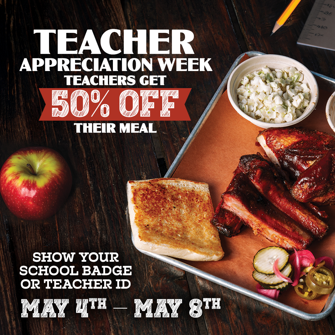 Teachers are the heart of the community and the week of May 4th–8th, we’re serving you. During that time, enjoy 50% off your meal with a valid school ID or badge. Take a break from the routine, step away from the classroom, and settle in for something made with love.